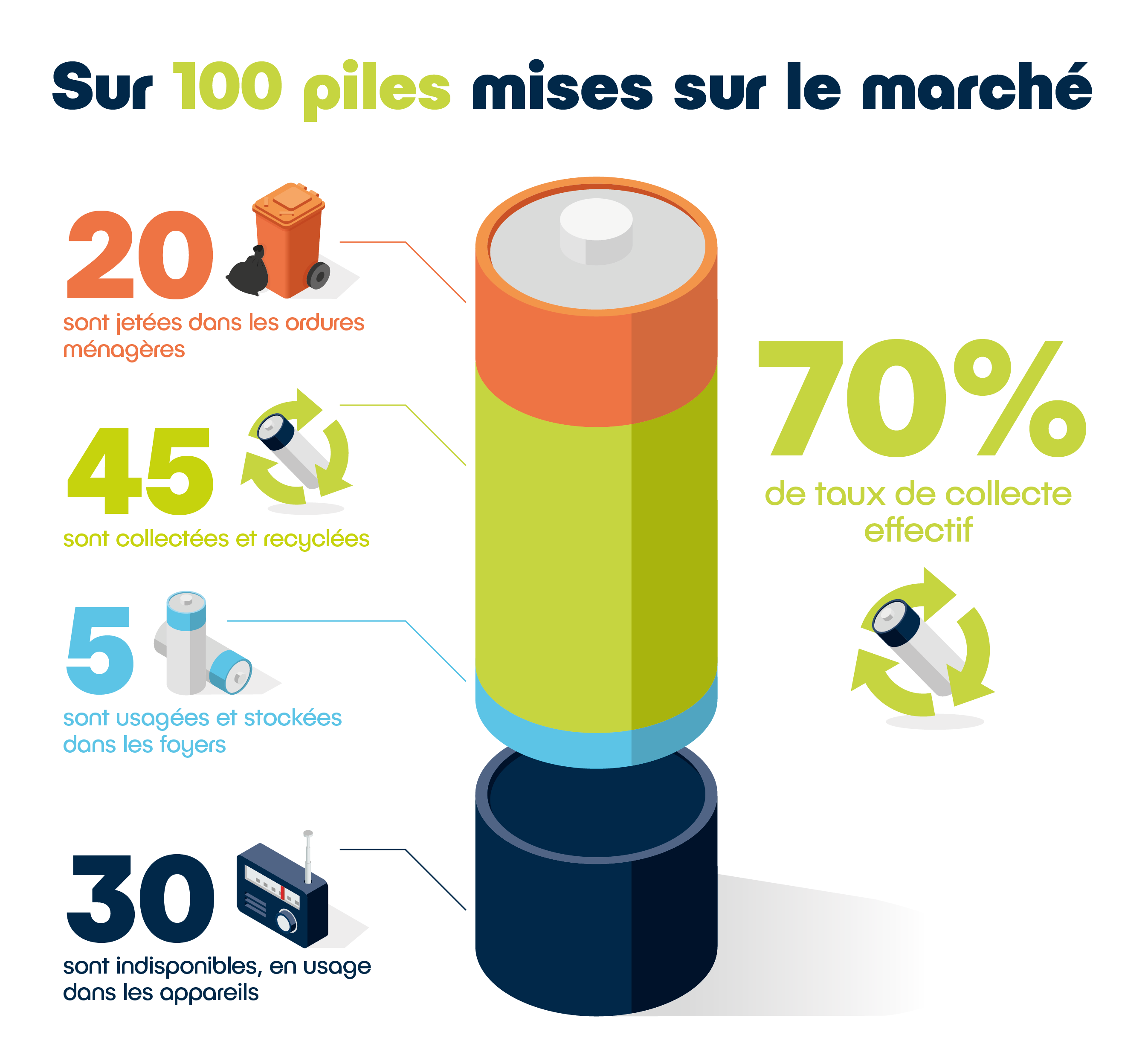 Saviez-vous qu’en moyenne, chaque maison contient 125 appareils avec des piles ou batteries ? Et pourtant, sur 100 piles, seulement 50 sont correctement recyclées. Les autres sont soit stockées, soit jetées dans les ordures ménagères ou dans la nature, ce qui représente un véritable danger pour l’environnement !