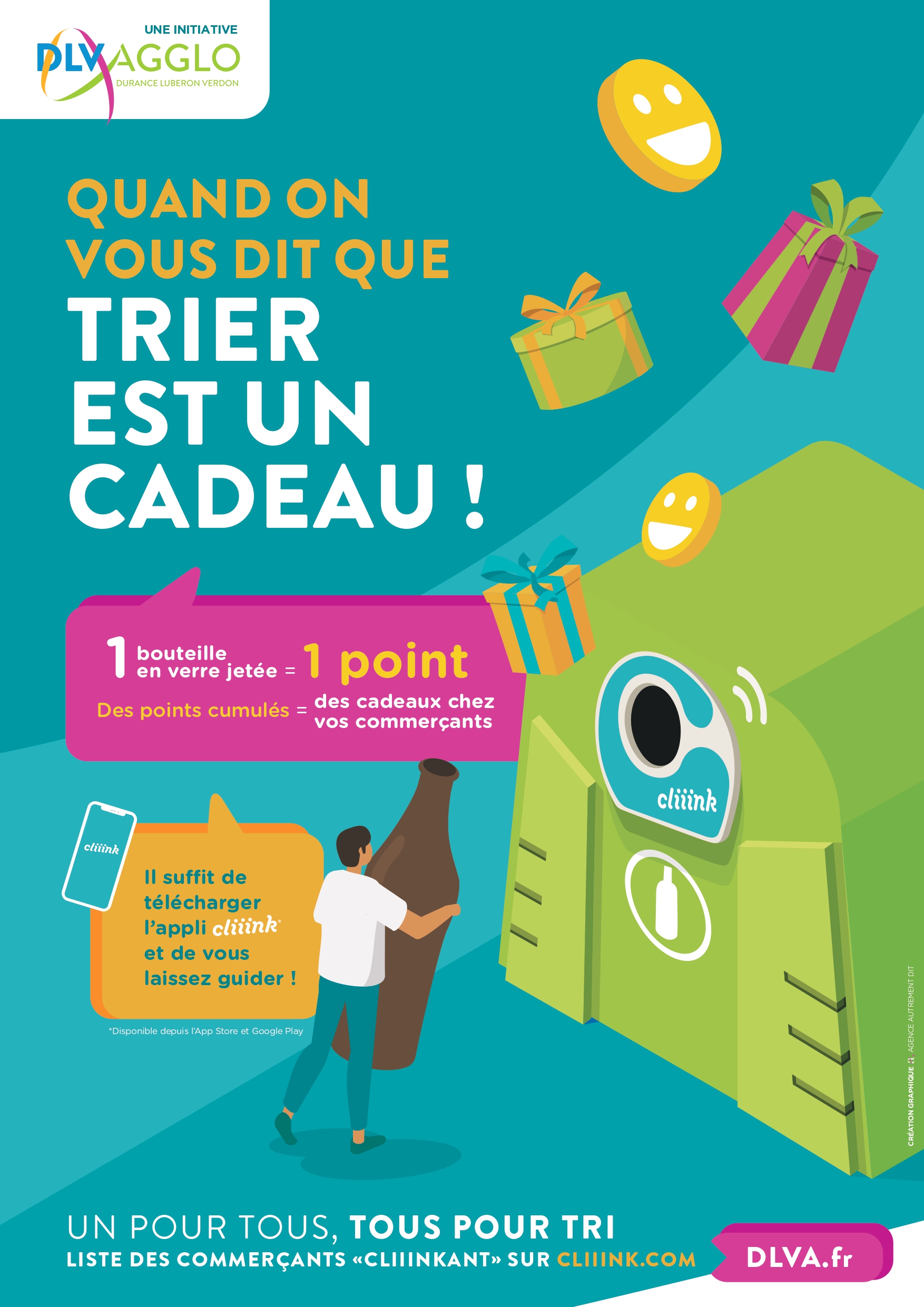 Cliiink c’est un dispositif permettant de récompenser le geste de tri ! En effet pour chaque déchet en verre jeté dans un conteneur à verre, vous recevrez un point sur votre compte Cliiink. Les points ainsi récoltés pourront ensuite être transformés en bons d’achat et utilisés chez des commerçants et artisans locaux, du territoire de l’Agglo !