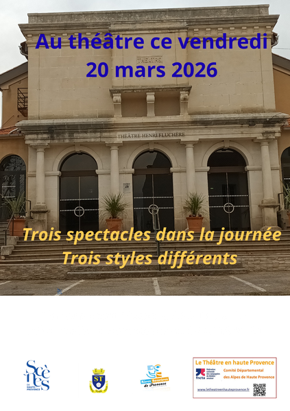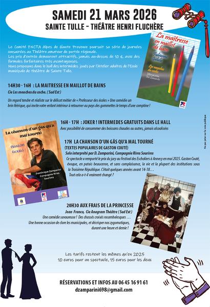 Trois spectacles joués par des groupes amateurs de la Région Sud Est avec des répertoires différents, à partir de 14h15 et jusqu’à 22h. Intermèdes et performances en off.