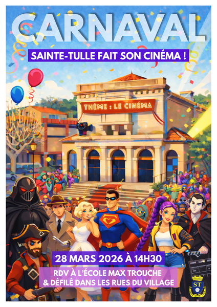 Carnaval : Sainte-Tulle fait son cinéma ! Cette année, les habitants ont choisi le thème du carnaval… et c’est LE CINÉMA qui a remporté les votes ! ⭐ Préparez vos plus beaux déguisements inspirés du 7ᵉ art : super-héros, princesses, pirates, personnages de dessins animés, stars de cinéma… tout est permis ! Un moment festif est ouvert à tous les Tullésains qui souhaitent venir défiler et partager un après-midi convivial. Samedi 28 mars Rendez-vous à l’école Max Trouche 14h30 : accueil des participants 15h : départ du défilé dans les rues du village 16h30 : élection du meilleur déguisement Alors, quel personnage de cinéma serez-vous ? En famille ou entre amis, venez faire vivre la magie du Carnaval dans les rues de Sainte-Tulle ! On vous attend nombreux pour défiler, rire et célébrer le Carnaval ensemble !