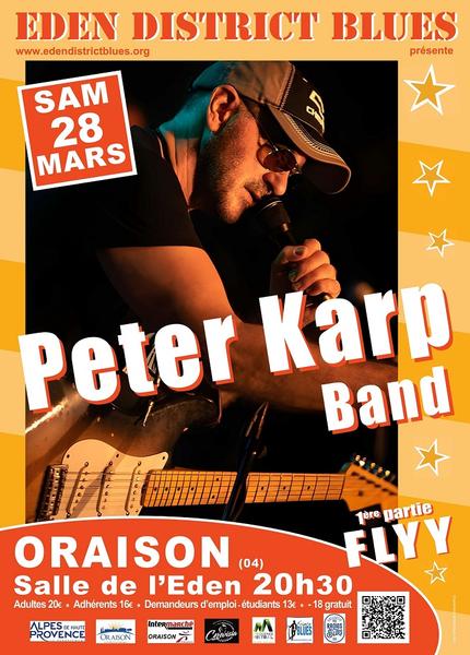 « Des gars comme Peter Karp, James Taylor et Bob Dylan incarnent le Blues et l’Americana, et nous, les Anglais, nous en sommes inspirés. » (Mick Taylor) Considéré comme un des meilleurs auteurs/compositeurs/interprètes de la scène Americana et Blues contemporaine, Peter Karp est reconnu internationalement pour son jeu de slide incandescent, son groove au piano, son talent de conteur et pour la puissance et l’expressivité de son chant qui font de lui un artiste remarquablement rare et original dans la musique roots américaine.En 2016, Karp a connu un succès international avec l’album « The Arson’s Match », enregistré en live avec Mick Taylor des Rolling Stones, un album qui a remporté trois prix Blues Blaster. Cette collaboration lui a permis de signer chez Blind Pig Records et d’enregistrer « Shadows and Cracks », un album qui s'est hissé dans le top 10 des classements Billboard et Blues. Il a ensuite continué à collaborer avec les plus grands noms du milieu, notamment pendant sept ans avec la guitariste de blues canadienne Sue Foley au sein du Karp-Foley Band, avant de se consacrer à nouveau à son propre groupe, sortir quelques albums et recevoir de nombreuses distinctions prestigieuses. En février 2026, Peter Karp sort son 12e album, «Jersey Town» publié par le label allemand «Make My Day Records ». Il est accompagné du superbe guitariste Mark Johnson (ex-Delta Moon) et des frères Paolo (batterie) et Marco Xeres (basse), bien connus pour avoir formé l'excellente section rythmique du groupe «Alligator Nail». FLYY. Né de la collaboration entre quatre musiciens d'expérience venus d'horizons divers qui se sont retrouvés entre la Vallée de l'Asse et celle du Verdon, FLYY distille une musique tonique où batterie, basse, guitare et harmonica s'unissent pour célébrer un blues polymorphe, mêlant shuffles, boogie, train-beat, rumba, honky tonk, funk, swing, un soupçon de rock'n roll et une pincée d'Afrique... Le tout servi avec des textes originaux en français. Laurent BERGER : Guitare Yves ROUX : Chant, harmonica, guitare Fabien CHAPPON : Basse Yannick PRÉAU : Batterie