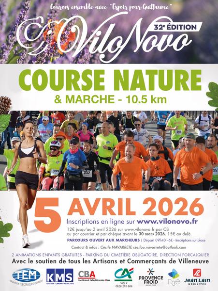 Retrait de dossard salle des fêtes à partir de 7h30 inscription en ligne sur www.vilonovo.fr 12€ jusqu'au 3 avril 2026 par CB Parcours ouvert aux marcheurs 6€ Départ 9h40 Contact et infos cecilou@outlook.com