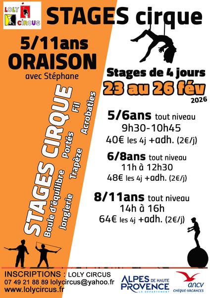 Des stages pour découvrir le cirque ou se perfectionner, dans une ambiance ludique et créative ! On fait des acrobaties, des portés, on apprend à marcher sur un fil, à faire des figures sur les boules, à dépasser ses peurs sur le trapèze et s’amuser à y faire de jolies postures… On découvre le hamac aérien et on apprend à jongler avec différents objets ! Un vrai tour du petit monde du cirque en un stage ! 9h30 à 10h45 5/6ans – 40€ les 4j + adh. 2€/jour ou 20€/an 11h à 12h30 6/8ans – 48€ les 4j + adh. 2€/jour ou 20€/an 14h à 16h 8/11ans tout niveau – 64€ les 4j + adh. 2€/jour ou 20€/an