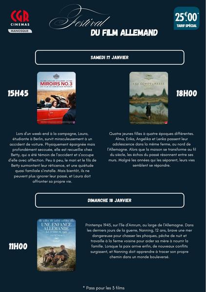 Samedi 17/01 à 15h45 : Miroir n°03, Christian Petzold Samedi 17/01 à 18h00 : Les échos du passé, Mascha Schilinsky Dimanche 18/01 à 11h00 : Une enfance allemande, Fatih Akin pass à 25€ pour les 3 films ou tarifs en vigueur.