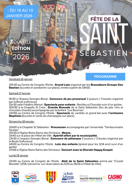 Vendredi 16 Janvier 20h30 au Centre de Congrès l’étoile : GRAND LOTO organisé par les Bravadeurs de Gréoux-les-Bains (buvette, pizza et sandwichs sur place), entrée à partir de 19h00 Samedi 17 Janvier 13h30 à Espace Georges Bonal : concours de pétanque organisé par la Boule Sulfureuse 15h à l’Eco ciné Verdon (Centre de congrès l’étoile) film gratuit à définir 20H30 au départ de la chapelle Sainte Croix : GRANDE BRAVADE de la Saint Sébastien avec fanfare suivi du feu de joie et du vin chaud 22h00 au Centre de congrès l’étoile : Spectacle de variétés et grand bal avec l’orchestre MEPHISTO, buvette et vente de champagne sur place Dimanche 18 Janvier 9h30 à Espace Georges Bonal : concours de boules au jeu provençal organisé par la Boule Sulfureuse 10h15 : départ de la chapelle Saint Sébastien : procession de la Saint Sébastien accompagnée par l’ensemble tambourinaire Sestian. 10h45 : église Notre Dame des Ormeaux : messe 11h45 : Place de l’hôtel de ville : apéritif offert par la municipalité 14h00 : au Centre de congrès l’étoile : entrée à 14h00 LOTO des enfants (gratuit) pour les 3/14 ans suivi d’un gouter, 17h00 : église Notre Dame des Ormeaux : Moment musical avec les professeurs de l’atelier musical à confirmer Lundi 19 Janvier 12h00 : au Centre de congrès l’étoile : Apéritif suivi de l’Aïoli de la Saint Sébastien animé par 3 musiciens de Crystal musette uniquement sur réservation : permanence en mairie du 5 au 16/01/2026