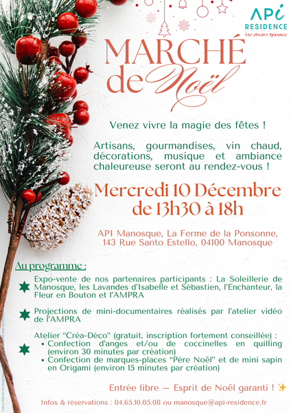 Expo-vente de nos partenaires participants : La Soleillerie de Manosque, les Lavandes d’Isabelle et Sébastien, l’Enchanteur, la Fleur en Bouton et l’AMPRA Projections de minis-documentaires réalisés par l’atelier vidéo de l’AMPRA Atelier “Créa-Déco” (gratuit, inscription fortement conseillée) : - Confection d’anges et/ou de coccinelles en quilling (environ 30 minutes par création) - Confection de marques-places “Père Noël” et de mini sapin en Origami (environ 15 minutes par création)