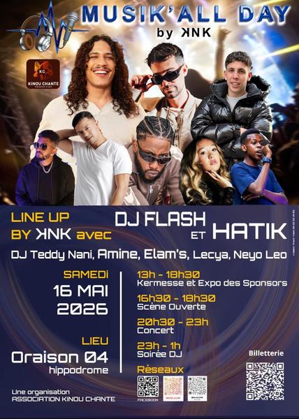 Nous aurons l’honneur d’accueillir KNK (The Voice Kids 2023) Lécya (The Voice Kids 2024) Neyo Léo Hatik Amine (Raï’N’B Fever) Elam's (Bande Organisée) ainsi que les DJ Teddy Nani et DJ Flash L’événement proposera également : une kermesse familiale, une exposition de nos artisans partenaires, une scène ouverte dédiée aux talents émergents. Une buvette (boissons, snacks et sandwichs) ainsi qu’un foodtruck seront présents sur place. 13h : Ouverture des portes – kermesse et exposition des artisans 16h30 – 18h30 : Scène ouverte 18h30 : Fermeture temporaire du site Accès payant (soirée concert) le lien vers la billetterie. Musik’all day - KINOU CHANTE 19h45 : Réouverture des portes 20h30 : Début des concerts 23h00 : Soirée DJ jusqu’à 1h00