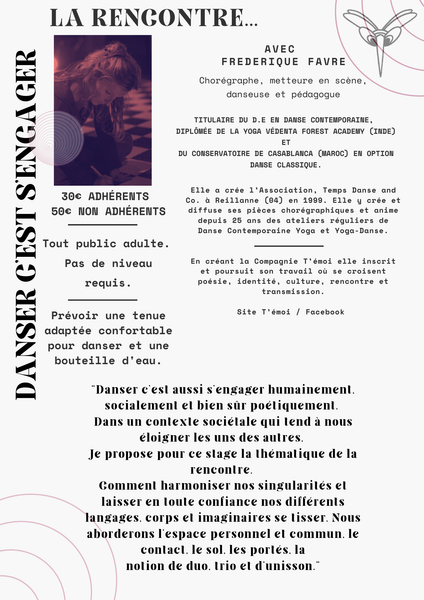 C'est comme un refrain dont on ne se lasse jamais. Pour la quatrième année, la danseuse et chorégraphe Frédérique Favre, nous fait le grand plaisir d'animer un stage de danse.