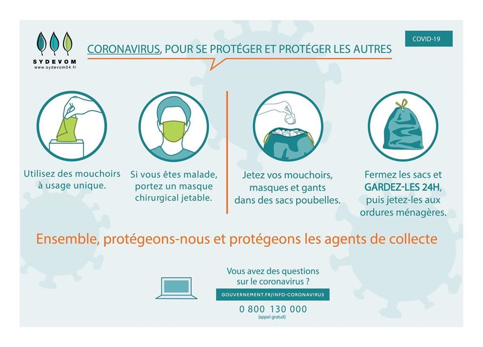 Pour vous protéger et protéger les autres notamment les agents de collecte, jetez vos mouchoirs et masques chirurgicaux dans des sacs FERMÉS dans les conteneurs d’ordures ménagères.
