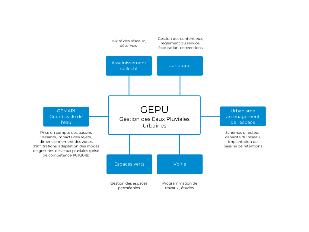 « La collecte, le transport, le stockage et le traitement des eaux pluviales des aires urbaines constitue un service public administratif relevant des communes, dénommé service public de Gestion des Eaux Pluviales Urbaines (loi 3/08/2018, transfert vers les agglomérations). »